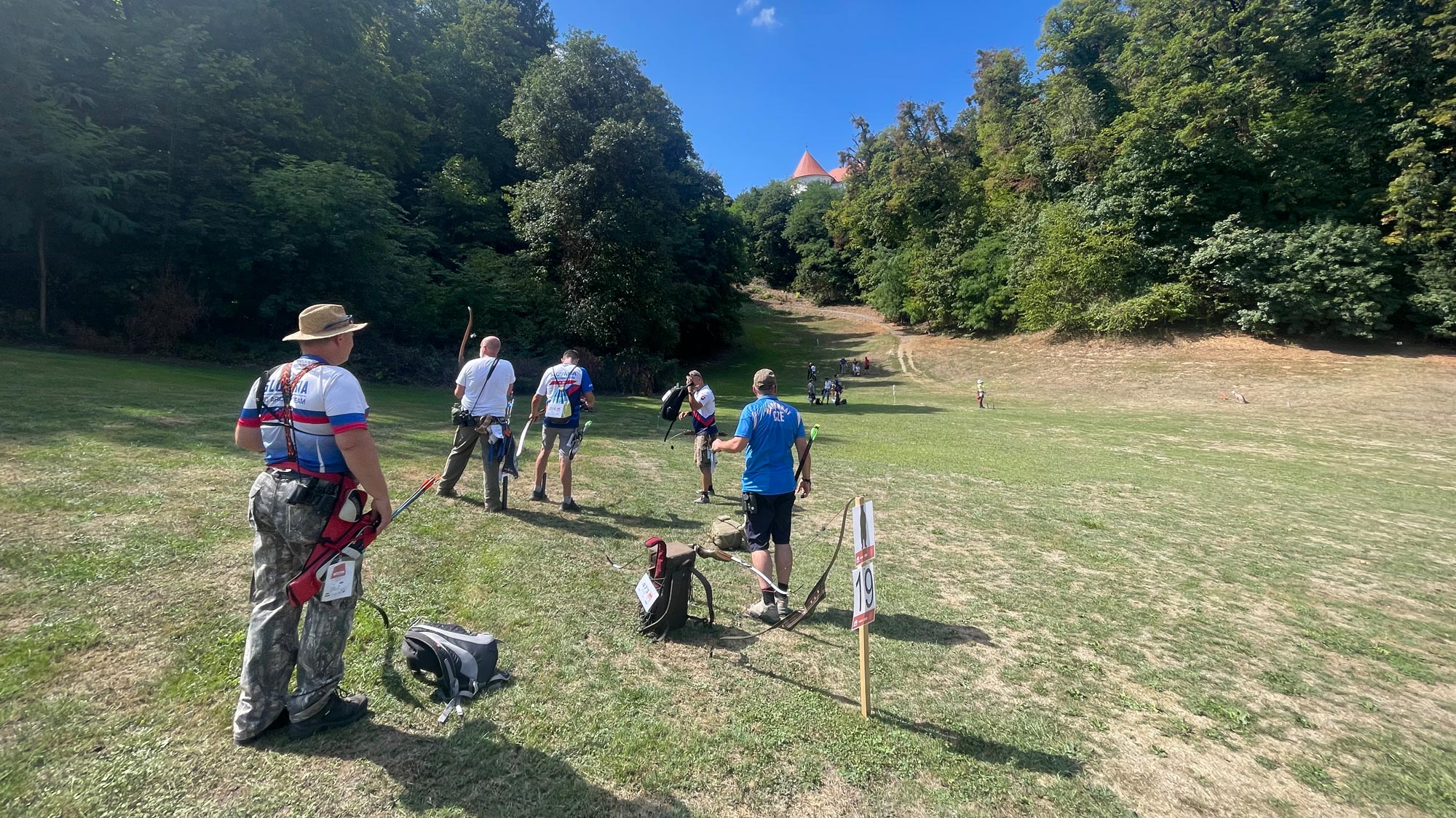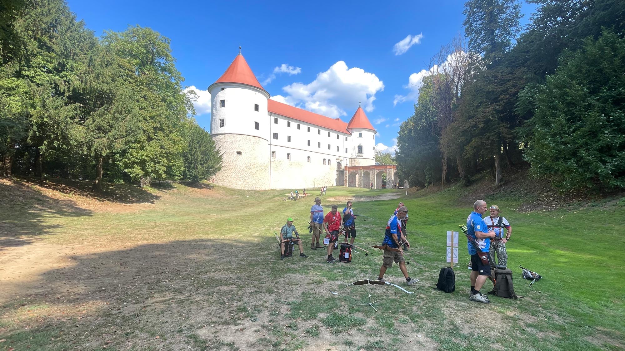 Unserer Wohngemeinschaft ging es durchwegs "ok" bis gut. Die Ergebnisse, wie im Allgemeinen, gut bis erfreulich. Es war ein heisser Tag. Die gesteckten Parcours sind nicht unbedingt immer im Schatten. Hier schießt man großteils auf einem Golfplatz rund um das Schloss Mokrice - es ist schön hier und die Kulisse des Schloßes begleitet die SchützInnen durch den Turniertag.