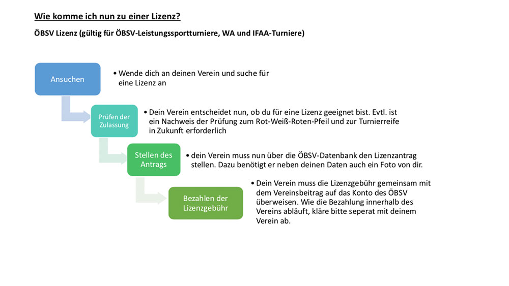 ÖBSV Lizenzen können ab 1. November für das Folgejahr beantragt werden. Diese werden jedoch erst freigegeben, wenn der Vereinsmitgliedsbeitrag und die Lizenzgebühr entrichtet wurde.