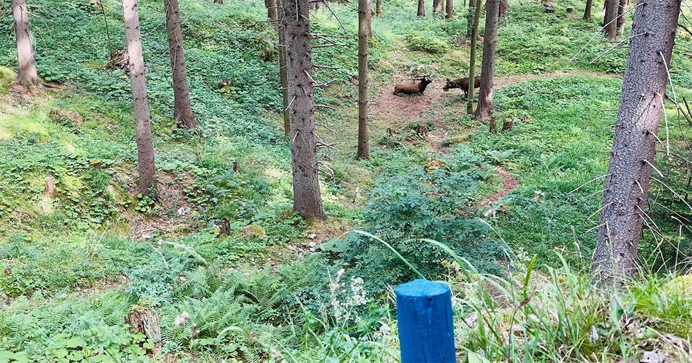 Beeindruckend ist der weite Schuss vom Felsen auf den Hirsch. Poldi die Hybridziege und Klein-Poldi sind ebenso vertreten wie ein furchterregender Grizzlybär.