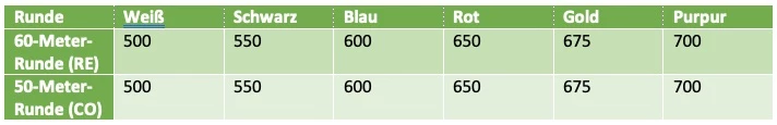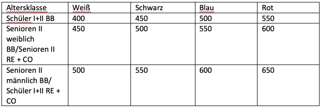 - RE Senioren II + CO Schüler II: 475 (Bronze), 500 (Silber), 525 (Gold), 550 (Gold + Edelstein)