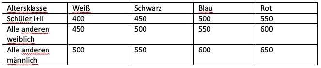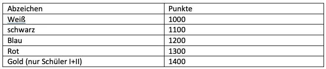 - Schüler I+II: 400 (Bronze), 425 (Silber), 450 (Gold), 475 (Gold + Edelstein)
