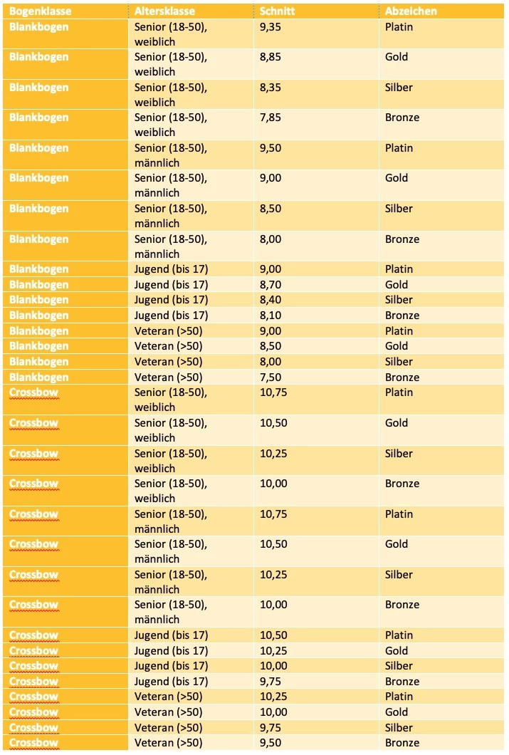 Man unterscheidet zwischen WA Abzeichen und ÖBSV Abzeichen. Die WA Abzeichen für 1440-Outdoor-Runden werden für (Olympic) Recurve und Compound verliehen. Für andere Scheibenrunden werden Scheibennadeln verliehen. Arrowhead-Abzeichen werden nur für Recurve, Compound und Blankbogen verliehen.