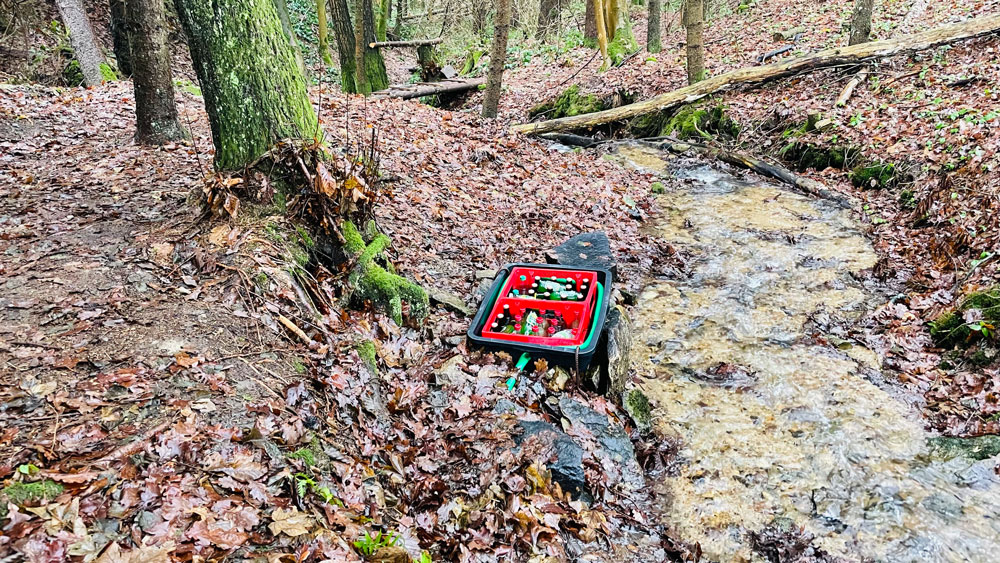 The drinks at the refreshment station are chilled by the stream's flow-through cooler. Erich is a clever fellow. The cooling line remains in the cool stream for about 20 meters—we'll thank him in the summer.