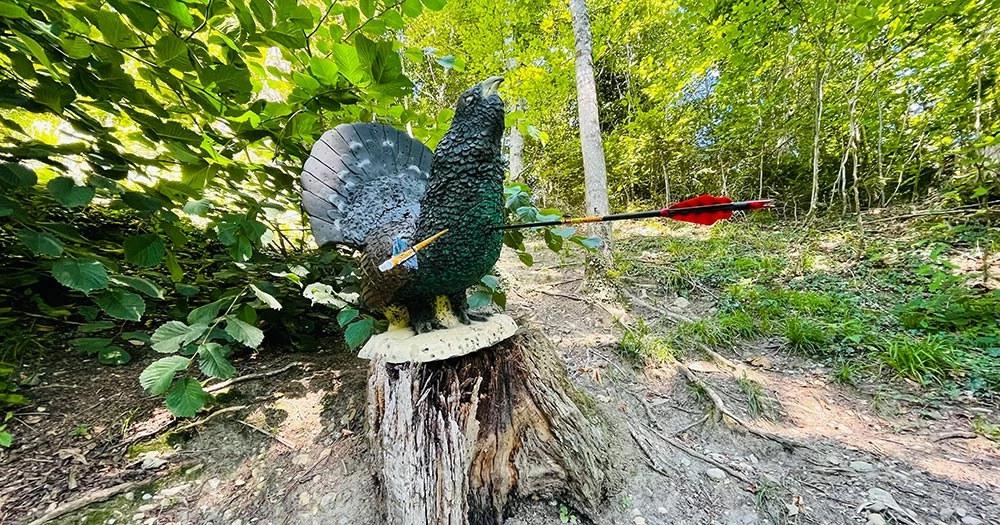 Three short courses with a total of 32 targets are combined into one. Up and down, we're in Vorarlberg after all. The shots and paths are in top condition. In total, we meet four hard-working "locals" who are taking great care of the course. They're hauling critters, sawing down trees, and forcing the stream back into its halfway bed—at least where you have to "cross over." And, of course, chatting a bit with the Lower Austrian tourists. ;)