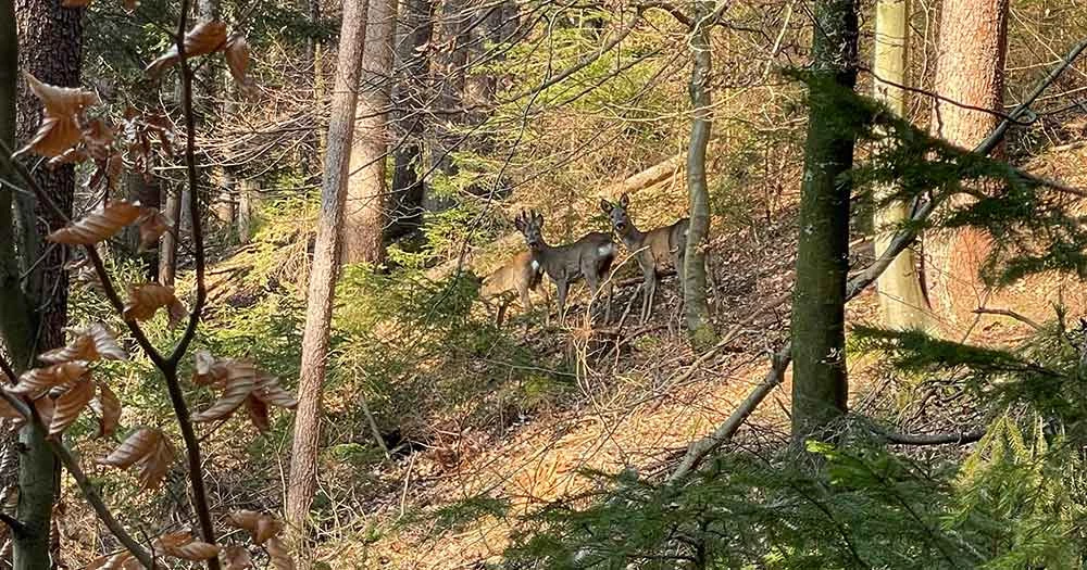 About two-thirds of the way through, we came across a nice group of deer... but WAIT! We're not shooting at them – moving targets from the real animal kingdom are the last thing we want to shoot at. We stay quiet and don't scare the deer. And lo and behold... they just walk along the course for a bit. At a distance, but still halfway close to us. At some point, they've had enough and they're gone.
